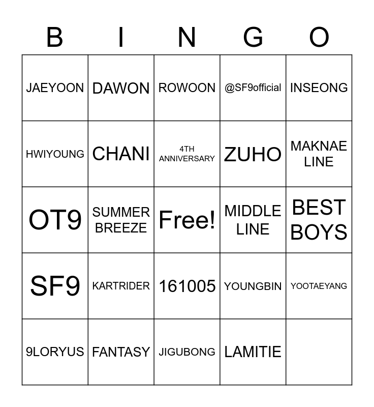 This bingo card has a free space and 24 words: SF9, FANTASY, 161005, YOUNGBIN, INSEONG, JAEYOON, DAWON, ROWOON, ZUHO, YOOTAEYANG, HWIYOUNG, CHANI, HYUNG LINE, MIDDLE LINE, MAKNAE LINE, 9LORYUS, SUMMER BREEZE, 4TH ANNIVERSARY, @SF9official, BEST BOYS, OT9, KARTRIDER, JIGUBONG and LAMITIE.