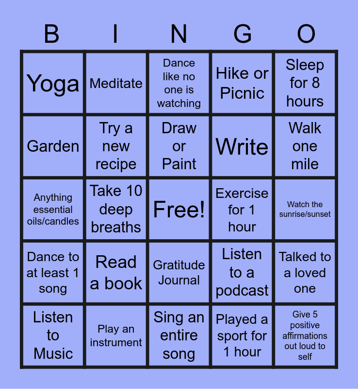 This bingo card has a free space and 24 words: Read a book, Play an instrument, Draw or Paint, Listen to Music, Sleep for 8 hours, Yoga, Garden, Meditate, Exercise for 1 hour, Gratitude Journal, Write, Anything essential oils/candles, Listen to a podcast, Talked to a loved one, Try a new recipe, Played a sport for 1 hour, Watch the sunrise/sunset, Dance like no one is watching, Walk one mile, Take 10 deep breaths, Give 5 positive affirmations out loud to self, Dance to at least 1 song, Hike or Picnic and Sing an entire song.