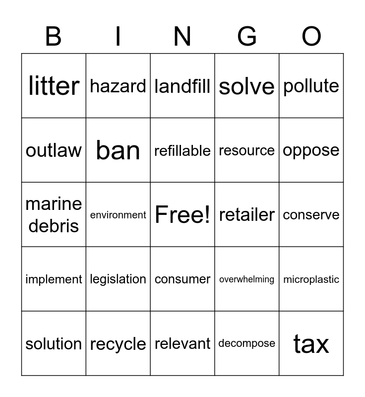 This bingo card has a free space and 29 words: solution, influence, environment, dispose, litter, landfill, ban, legislation, retailer, recycle, conserve, tax, relevant, decompose, oppose, support, consumer, implement, pollute, marine debris, overwhelming, contaminate, resource, outlaw, solve, hazard, microplastic, refillable and potential.