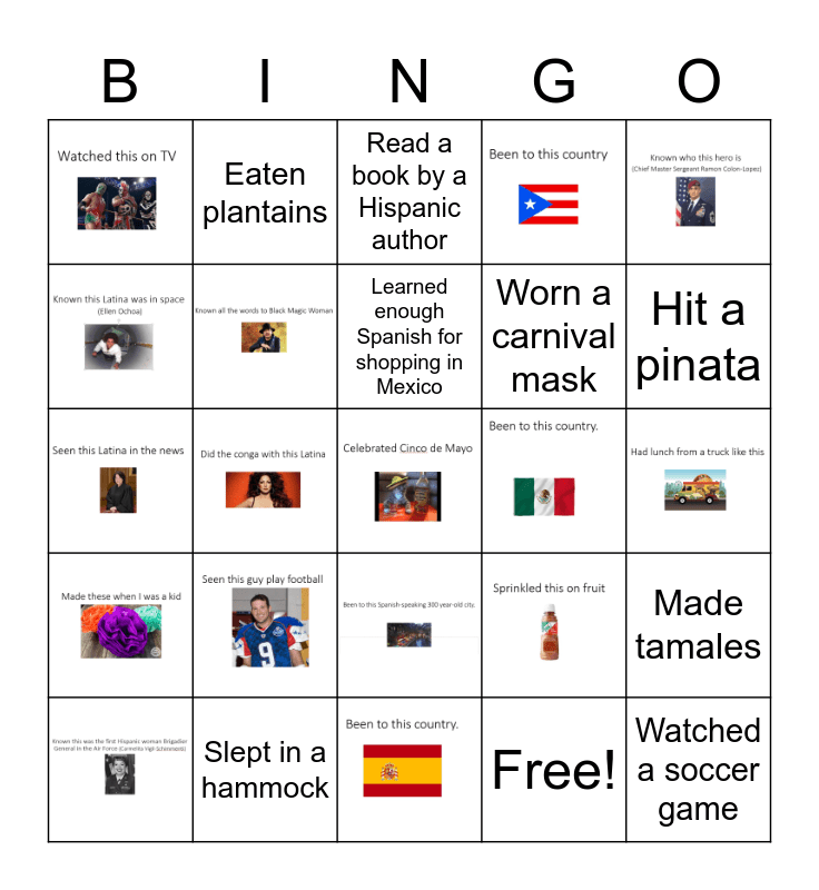 This bingo card has 18 images and 12 words: Slept in a hammock, Played the guitar, Read a book by a Hispanic author, Free!, Watched a soccer game, Hit a pinata, Had a Cuban cigar, Eaten plantains, Worn a carnival mask, Made tamales, Learned enough Spanish for shopping in Mexico and Put guacamole on everything.
