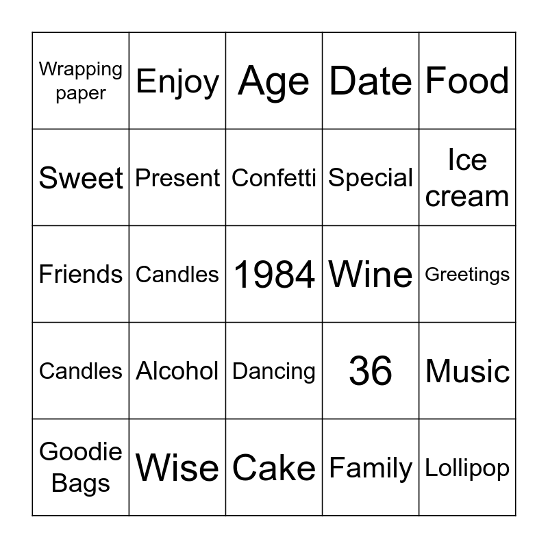 This bingo card has a free space and 24 words: Alcohol, Wise, Confetti, Goodie Bags, Food, Wrapping paper, Sweet, Enjoy, Wine, Dancing, Special, Friends, 36, Music, Present, Family, Greetings, Age, Ice cream, Candles, Lollipop, Candles, Date and Cake.