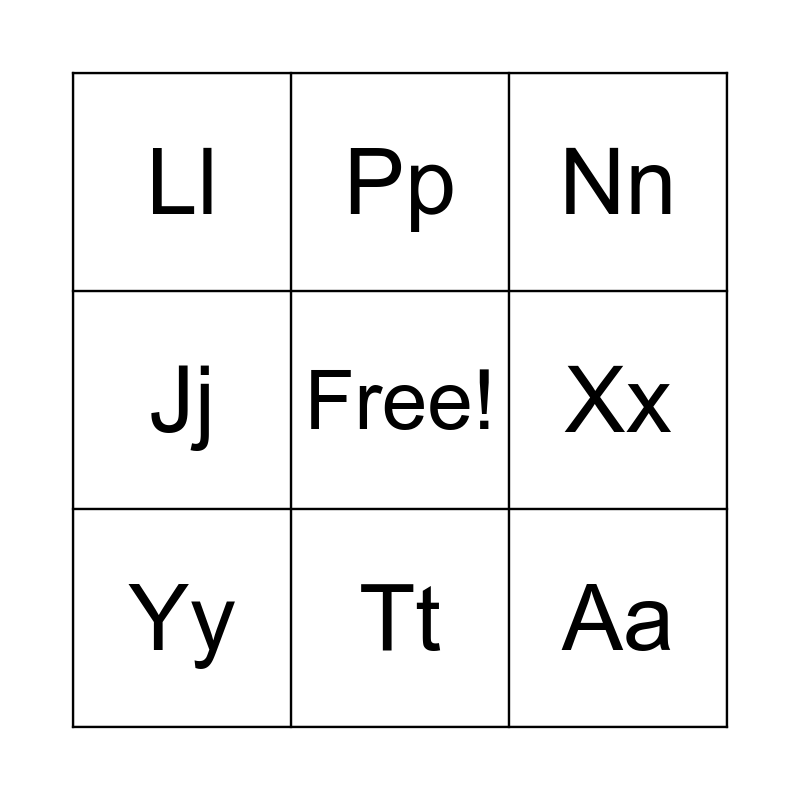 This bingo card has a free space and 26 words: Mm, Ss, Tt, Oo, Aa, Ll, Xx, Pp, Bb, Cc, Dd, Ee, Ff, Gg, Hh, Ii, Jj, Kk, Nn, Qq, Rr, Uu, Vv, Ww, Yy and Zz.