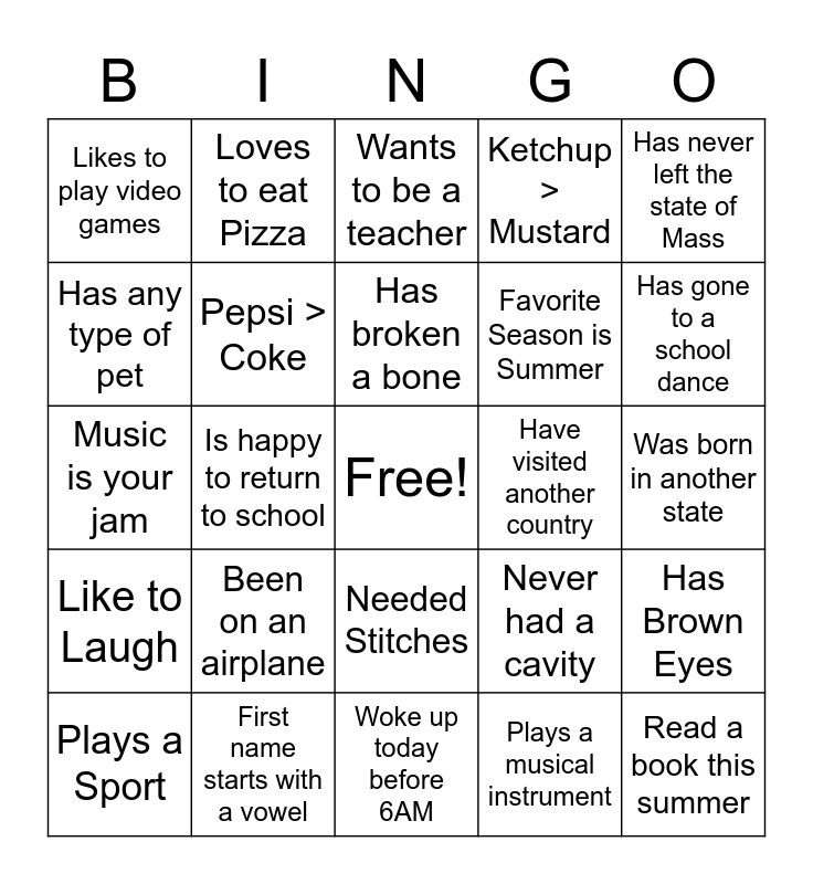 This bingo card has a free space and 24 words: Been on an airplane, First name starts with a vowel, Has broken a bone, Plays a Sport, Has never left the state of Mass, Likes to play video games, Has any type of pet, Loves to eat Pizza, Have visited another country, Needed Stitches, Favorite Season is Summer, Music is your jam, Never had a cavity, Has Brown Eyes, Pepsi > Coke, Plays a musical instrument, Was born in another state, Wants to be a teacher, Has gone to a school dance, Is happy to return to school, Read a book this summer, Like to Laugh, Ketchup > Mustard and Woke up today before 6AM.