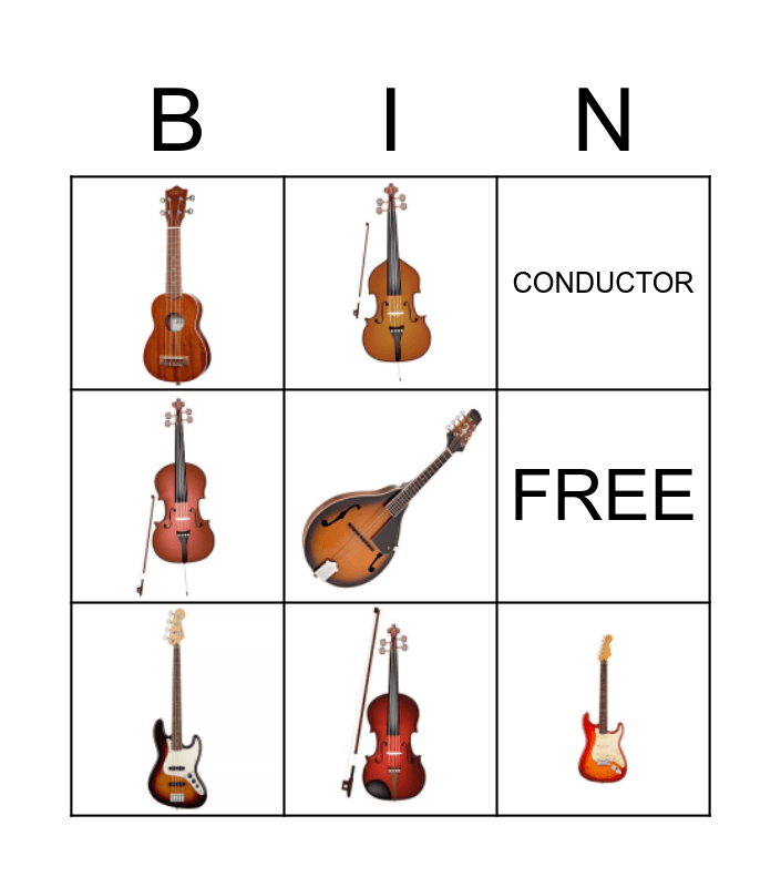 This bingo card has 10 images, a free space and 3 words: FREE, CONDUCTOR and LUTE.