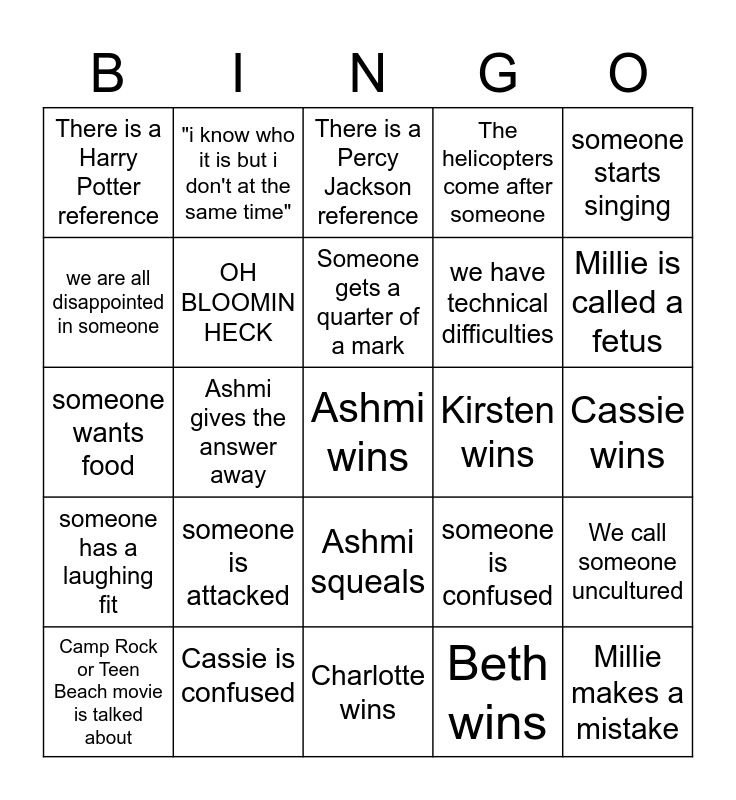 This bingo card has 30 words: Cassie is confused, Kirsten starts shouting, Ashmi gives the answer away, There is a twilight reference, There is a Harry Potter reference, There is a Percy Jackson reference, OH BLOOMIN HECK, Ashmi squeals, Kirsten wins, Charlotte wins, Cassie wins, Ashmi wins, Beth wins, Millie makes a mistake, Millie is called a fetus, Someone has HAD ENOUGH OF PLAYING GAMES, someone is confused, someone has a laughing fit, someone is attacked, someone starts singing, someone wants food, Someone do be vibing., "i know who it is but i don't at the same time", we have technical difficulties, we are all disappointed in someone, The helicopters come after someone, We call someone uncultured, Camp Rock or Teen Beach movie is talked about, Someone gets a quarter of a mark and someone is DISCOSTAD.