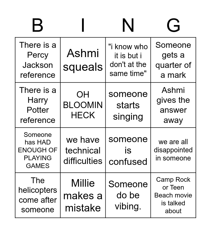 This bingo card has 25 words: Cassie is confused, Kirsten starts shouting, Ashmi gives the answer away, There is a twilight reference, There is a Harry Potter reference, There is a Percy Jackson reference, OH BLOOMIN HECK, Ashmi squeals, Millie makes a mistake, Millie is called a fetus, Someone has HAD ENOUGH OF PLAYING GAMES, someone is confused, someone has a laughing fit, someone is attacked, someone starts singing, someone wants food, Someone do be vibing., "i know who it is but i don't at the same time", we have technical difficulties, we are all disappointed in someone, The helicopters come after someone, We call someone uncultured, Camp Rock or Teen Beach movie is talked about, Someone gets a quarter of a mark and someone is DISCOSTAD.