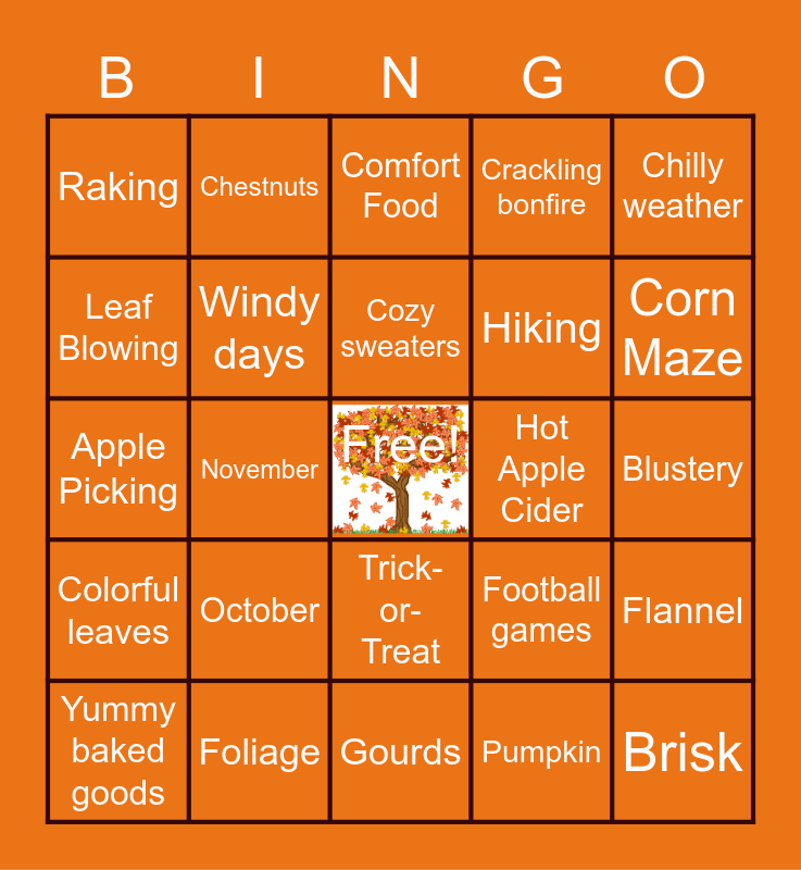 This bingo card has a free space and 36 words: Squash, Harvest season, Scarecrow, Windy days, Football games, Colorful leaves, Cozy sweaters, Hay Ride, Chilly weather, Autumn, November, Crackling bonfire, Festival, Hot Apple Cider, Corn Maze, Raking, Pumpkin Spice Latte, October, Brisk, Comfort Food, Blustery, Flannel, Foliage, Yummy baked goods, Gourds, Chestnuts, Apple Picking, Hot Cocoa with marshmallows, Hiking, Leaf Blowing, Halloween, Haunted House, Pumpkin, Trick-or-Treat, Costumes and Soft Blankets.