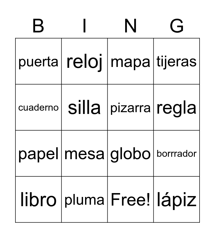 This bingo card has 17 words: Free!, libro, mapa, puerta, mesa, tijeras, borrrador, pizarra, regla, silla, pluma, globo, cuaderno, reloj, papel, calendario and lápiz.