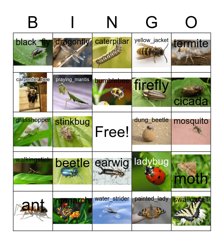 This bingo card has 24 images, a free space and 24 words: beetle, monarch, bumblebee, ant, termite, black_fly, carpenter_bee, dragonfly, dung_beetle, earwig, firefly, grasshopper, ladybug, moth, praying_mantis, painted_lady, mosquito, caterpillar, cicada, stinkbug, swallowtail, walkingstick, yellow_jacket and water_strider.
