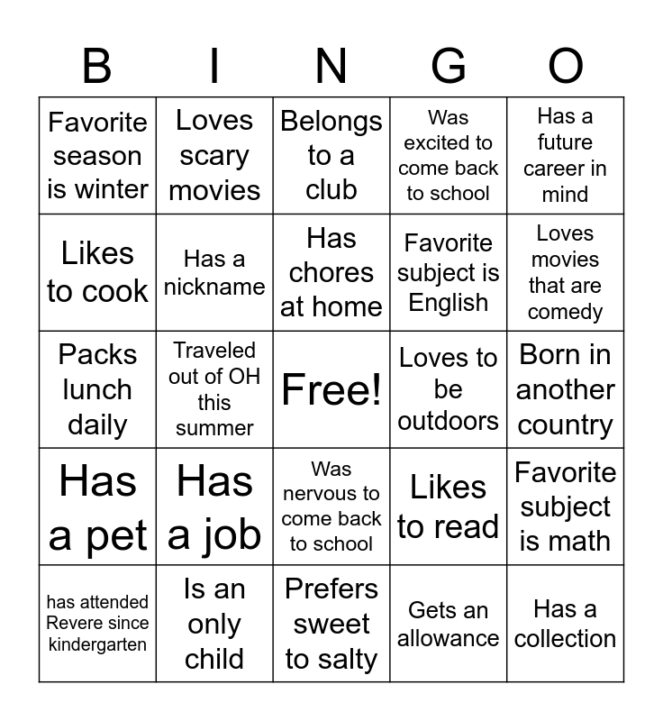This bingo card has a free space and 29 words: has attended Revere since kindergarten, Learned a new skill during the quarantine, Traveled out of OH this summer, Plays a musical instrument, Favorite season is winter, Belongs to a club, Has a nickname, Has a job, Loves to be outdoors, Is an only child, Born in another country, Has a collection, Prefers sweet to salty, Gets an allowance, Loves movies that are comedy, Plays a sport, Was nervous to come back to school, Has a pet, Has a future career in mind, Packs lunch daily, Likes to read, Knows his/her preferred learning style, Favorite subject is English, Likes to cook, Was excited to come back to school, Loves scary movies, Favorite subject is math, Has chores at home and Is creative.
