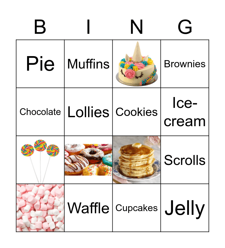 This bingo card has 5 images and 11 words: Waffle, Scrolls, Pie, Muffins, Cupcakes, Chocolate, Lollies, Brownies, Ice-cream, Cookies and Jelly.