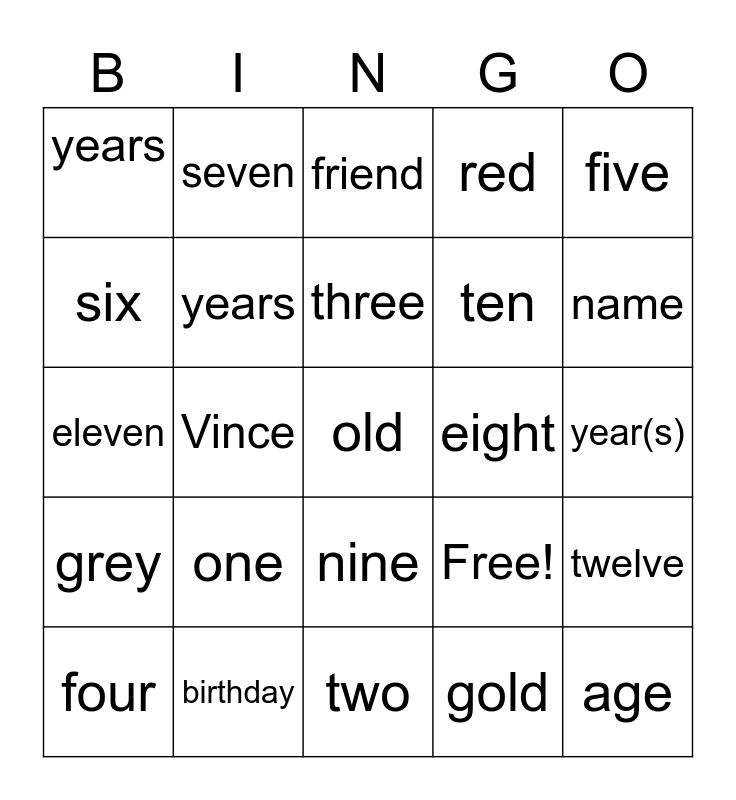 This bingo card has 25 words: one, two, three, four, five, years, six, seven, eight, nine, ten, eleven, Free!, twelve, years, age, year(s), friend, name, Vince, old, birthday, grey, red and gold.