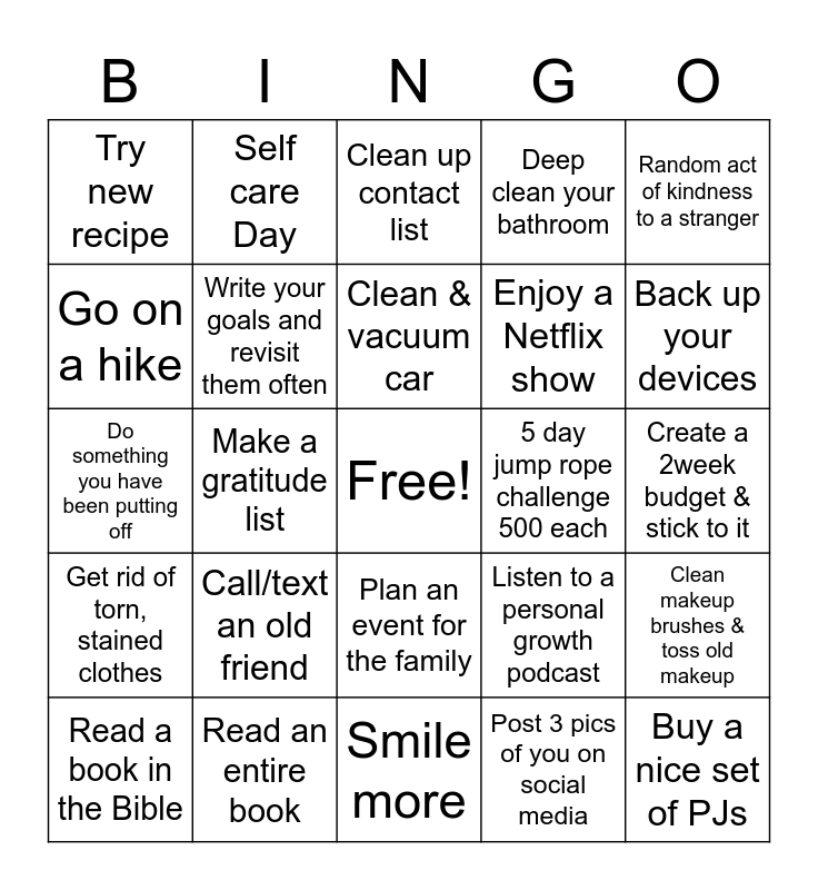 This bingo card has a free space and 24 words: Read a book in the Bible, Call/text an old friend, Clean & vacuum car, Post 3 pics of you on social media, Random act of kindness to a stranger, Try new recipe, Self care Day, Clean up contact list, 5 day jump rope challenge 500 each, Create a 2week budget & stick to it, Do something you have been putting off, Write your goals and revisit them often, Listen to a personal growth podcast, Clean makeup brushes & toss old makeup, Go on a hike, Read an entire book, Smile more, Deep clean your bathroom, Back up your devices, Get rid of torn, stained clothes, Make a gratitude list, Plan an event for the family, Enjoy a Netflix show and Buy a nice set of PJs.