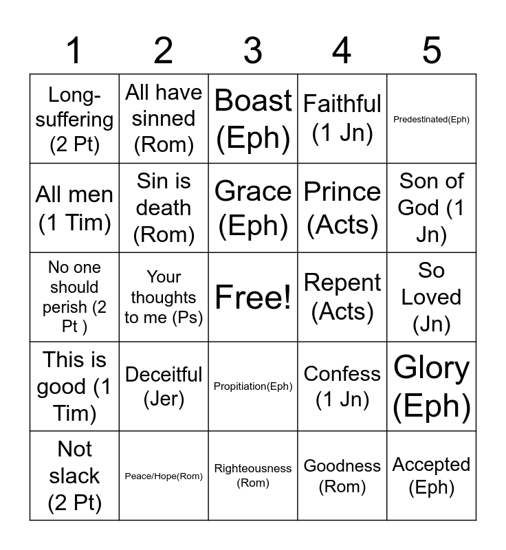 This bingo card has a free space and 24 words: Not slack (2 Pt), Deceitful (Jer), Grace (Eph), Goodness (Rom), Predestinated(Eph), Long-suffering (2 Pt), All have sinned (Rom), Boast (Eph), Repent (Acts), So Loved (Jn), No one should perish (2 Pt ), Sin is death (Rom), Confess (1 Jn), Glory (Eph), All men (1 Tim), Peace/Hope(Rom), Righteousness (Rom), Faithful (1 Jn), Son of God (1 Jn), This is good (1 Tim), Your thoughts to me (Ps), Propitiation(Eph), Prince (Acts) and Accepted (Eph).