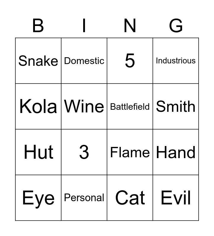 This bingo card has 69 words: 18, Cat, Umuofia, Harmattan, Walk, Unoka, Industrious, Egwugwu, Kola, Ibo, None, Gong, Snake, 5, Ikemefuna, Hand, Son, Hut, Hills & The Caves, Evil, Personal, 3/4, 3, Peace, Okonkwo, Father, Earth, Vegetable, Banana, Ancestral, Domestic, Sniff it, Tortoise, Agbala, Ekwe & Okonkwo, Wedding, Cook in it, Goats, Wine, 7, Palm, Eye, Son, Earth, Yams, Mbanta, Enoch, Compound, Ogbanje, Battlefield, Smith, Missionaries, Christianity, Efulefu, Nwoye, Forest, Die, Sunday, Anger, Flame, Government, Osu, Hair, Python, God, Ochu, Chi, War and Title.