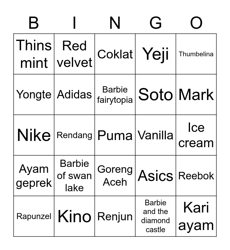 This bingo card has a free space and 24 words: Rapunzel, Barbie of swan lake, Barbie fairytopia, Barbie and the diamond castle, Thumbelina, Thins mint, Red velvet, Coklat, Vanilla, Ice cream, Nike, Adidas, Asics, Reebok, Yongte, Kino, Renjun, Yeji, Mark, Ayam geprek, Rendang, Goreng Aceh, Soto and Kari ayam.