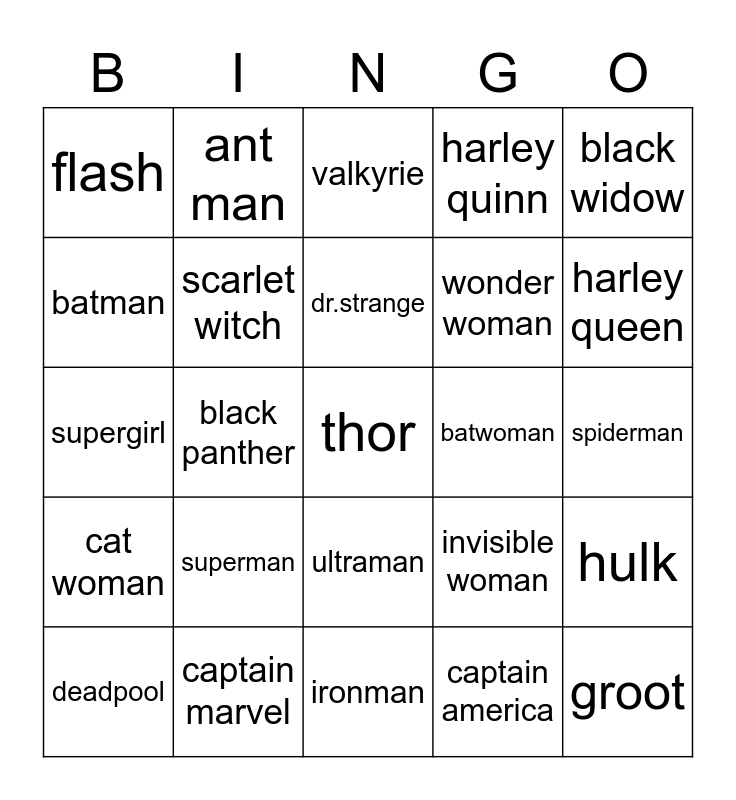 This bingo card has a free space and 24 words: superman, captain marvel, dr.strange, deadpool, black widow, flash, batman, ant man, batwoman, ultraman, wonder woman, supergirl, invisible woman, hulk, scarlet witch, captain america, spiderman, valkyrie, harley queen, black panther, groot, cat woman, harley quinn and ironman.