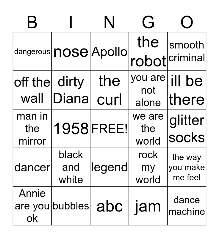 This bingo card has a free space and 24 words: black and white, bubbles, the curl, Annie are you ok, smooth criminal, dangerous, off the wall, nose, we are the world, legend, you are not alone, man in the mirror, rock my world, the way you make me feel, dirty Diana, jam, glitter socks, Apollo, ill be there, 1958, dance machine, dancer, the robot and abc.