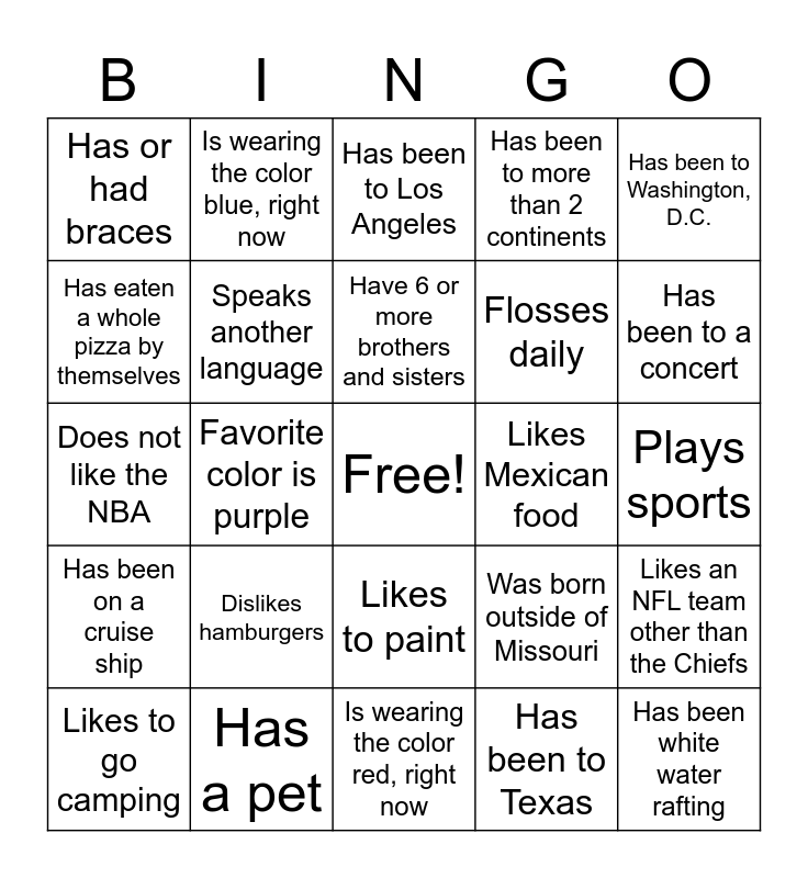 This bingo card has a free space and 39 words: Is an only child, Loves country music, Has been to Europe, Speaks another language, Likes to go camping, Likes to paint, Have 6 or more brothers and sisters, Likes to sing, Has been to Washington, D.C., Has been on a cruise ship, Favorite color is purple, Has been to more than 2 continents, Has been white water rafting, Plays sports, Likes Mexican food, Dislikes hamburgers, Has been to a history museum, Has or had braces, Has met a famous person, Was born outside of Missouri, Has eaten a whole pizza by themselves, Is wearing the color red, right now, Flosses daily, Has been to a concert, Loves Rap music, Favorite color is orange, Likes sushi, Has been to an art museum, Has been to a protest, Is wearing the color blue, right now, Favorite subject is art, Wants to be a doctor or lawyer, Has been to Los Angeles, Has a pet, Has been to Texas, Has been to a zoo outside of Kansas City, Likes an NFL team other than the Chiefs, Does not like the NBA and Likes a college sports team other than KU or MU.