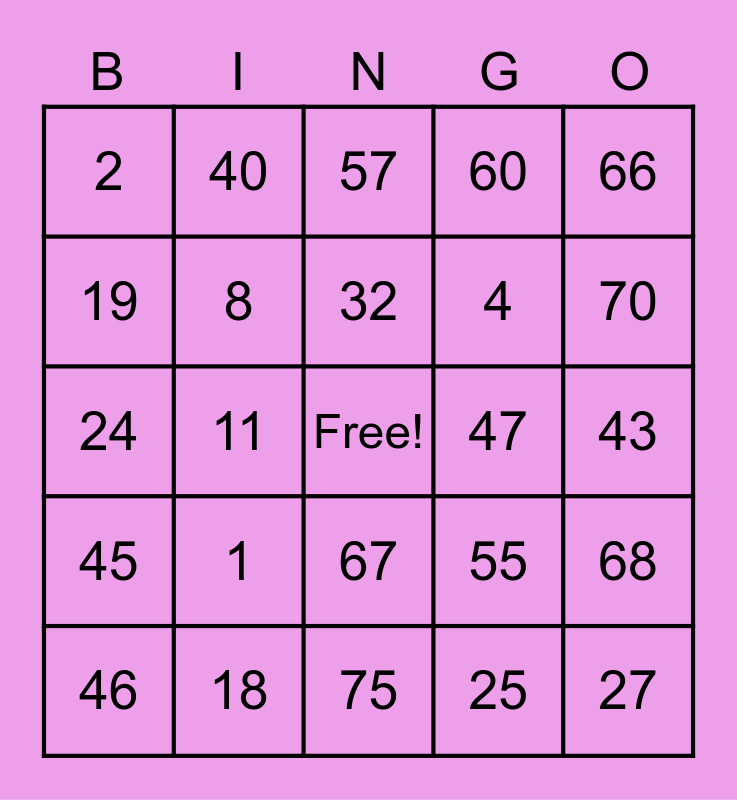 This bingo card has a free space and 24 words: 1, 18, 32, 46, 66, 2, 19, 40, 47, 67, 4, 24, 55, 68, 8, 25, 43, 57, 70, 11, 27, 45, 60 and 75.