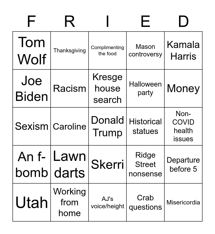 This bingo card has a free space and 24 words: Lawn darts, Working from home, Kresge house search, Utah, Kamala Harris, Tom Wolf, Joe Biden, Thanksgiving, Historical statues, Skerri, Halloween party, Sexism, Ridge Street nonsense, Departure before 5, Racism, Crab questions, Non-COVID health issues, Complimenting the food, Money, Caroline, Misericordia, An f-bomb, Mason controversy and AJ's voice/height.