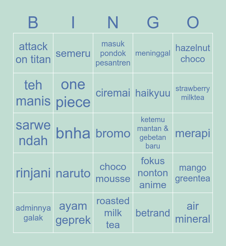 This bingo card has a free space and 24 words: naruto, ayam geprek, ciremai, adminnya galak, hazelnut choco, attack on titan, teh manis, semeru, ketemu mantan & gebetan baru, choco mousse, haikyuu, sarwe ndah, fokus nonton anime, mango greentea, one piece, betrand, merapi, masuk pondok pesantren, strawberry milktea, bnha, air mineral, rinjani, meninggal and roasted milk tea.