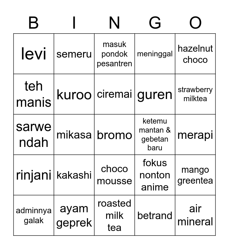 This bingo card has a free space and 24 words: kakashi, ayam geprek, ciremai, adminnya galak, hazelnut choco, levi, teh manis, semeru, ketemu mantan & gebetan baru, choco mousse, guren, sarwe ndah, fokus nonton anime, mango greentea, kuroo, betrand, merapi, masuk pondok pesantren, strawberry milktea, mikasa, air mineral, rinjani, meninggal and roasted milk tea.