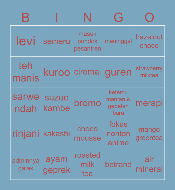 This bingo card has a free space and 24 words: kakashi, ayam geprek, ciremai, adminnya galak, hazelnut choco, levi, teh manis, semeru, ketemu mantan & gebetan baru, choco mousse, guren, sarwe ndah, fokus nonton anime, mango greentea, kuroo, betrand, merapi, masuk pondok pesantren, strawberry milktea, suzue kambe, air mineral, rinjani, meninggal and roasted milk tea.
