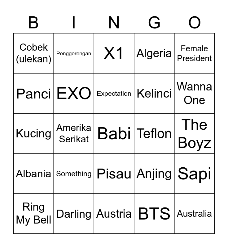 This bingo card has a free space and 24 words: Something, Darling, Expectation, Ring My Bell, Female President, Cobek (ulekan), Panci, Penggorengan, Teflon, Pisau, Kelinci, Kucing, Anjing, Sapi, EXO, BTS, The Boyz, X1, Wanna One, Amerika Serikat, Australia, Albania, Algeria and Austria.