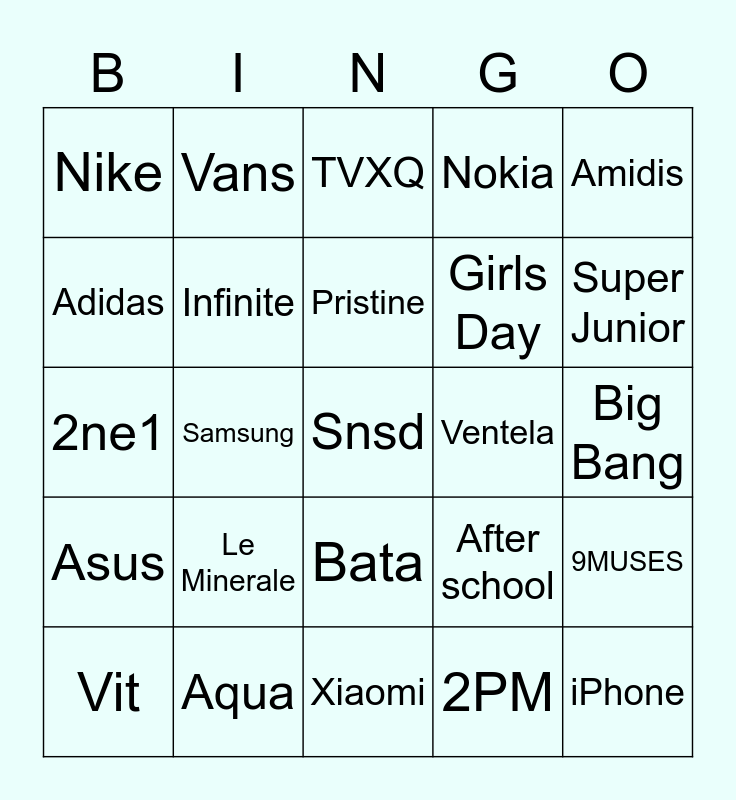 This bingo card has a free space and 24 words: Le Minerale, Aqua, Pristine, Vit, Amidis, Nike, Adidas, Vans, Ventela, Bata, Girls Day, 2ne1, After school, 9MUSES, Infinite, 2PM, Big Bang, TVXQ, Super Junior, Samsung, iPhone, Asus, Nokia and Xiaomi.