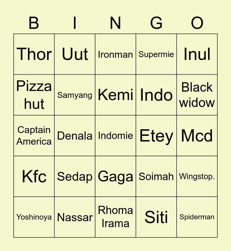 This bingo card has a free space and 24 words: Sedap, Nassar, Kemi, Yoshinoya, Inul, Thor, Pizza hut, Uut, Etey, Gaga, Indo, Captain America, Soimah, Wingstop., Samyang, Siti, Mcd, Ironman, Black widow, Denala, Spiderman, Kfc, Supermie and Rhoma Irama.