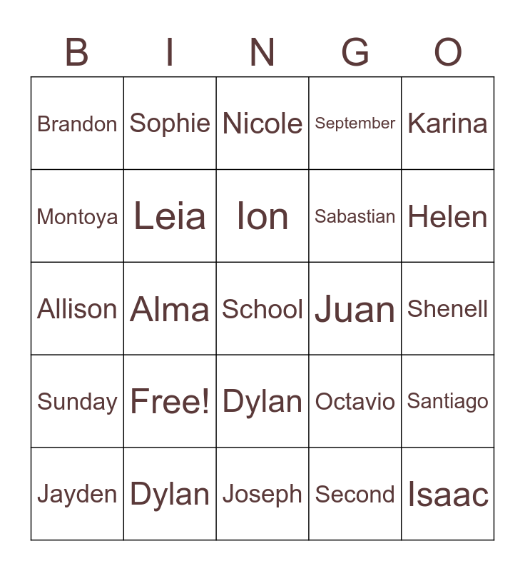 This bingo card has 25 words: Free!, Joseph, Ion, Jayden, Karina, Brandon, Montoya, Sophie, Juan, Dylan, Sabastian, Allison, Octavio, Santiago, Leia, Isaac, Shenell, Nicole, Helen, Alma, School, Dylan, Sunday, September and Second.