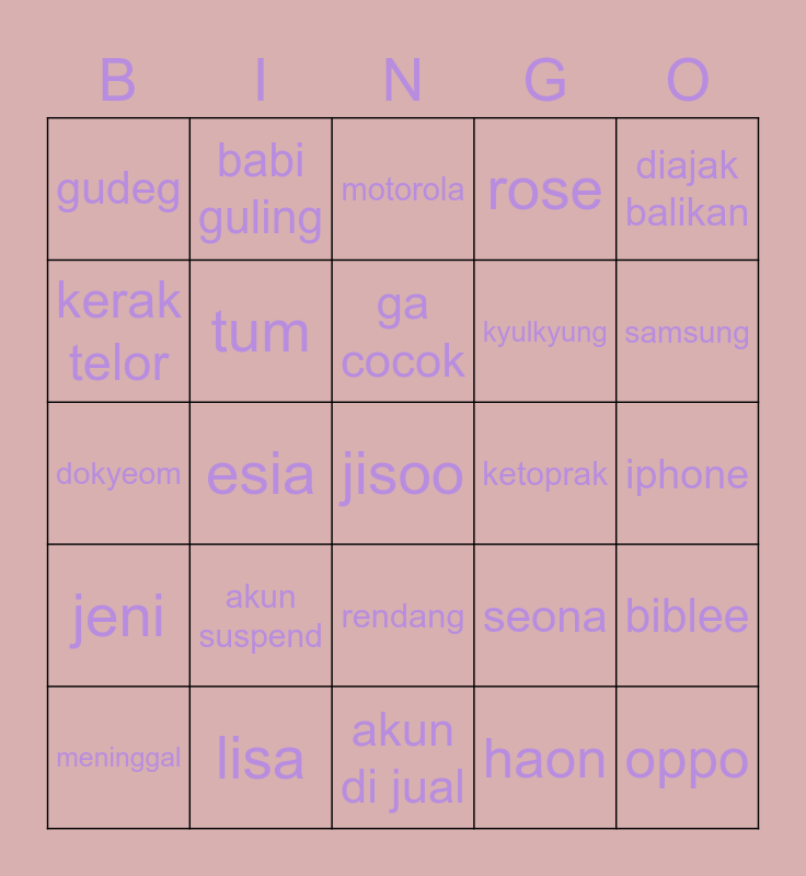 This bingo card has 25 words: akun suspend, akun di jual, ga cocok, meninggal, diajak balikan, gudeg, kerak telor, babi guling, ketoprak, rendang, kyulkyung, dokyeom, seona, biblee, tum, oppo, iphone, motorola, samsung, esia, jisoo, lisa, jeni, rose and haon.