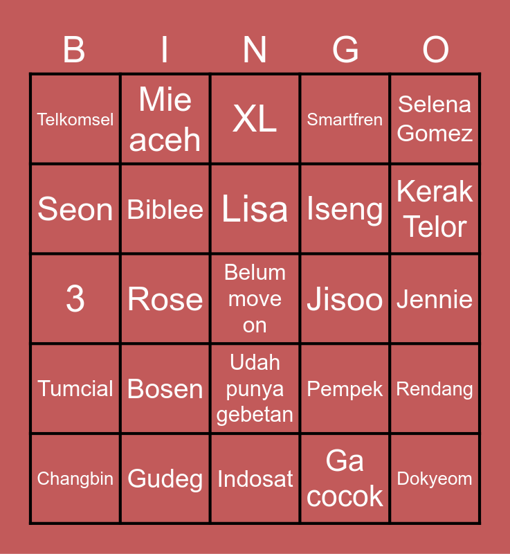This bingo card has 25 words: Bosen, Indosat, Lisa, Changbin, Selena Gomez, Telkomsel, Seon, Mie aceh, Jisoo, Udah punya gebetan, Iseng, 3, Pempek, Rendang, Biblee, Dokyeom, Jennie, XL, Kerak Telor, Rose, Belum move on, Gudeg, Tumcial, Smartfren and Ga cocok.