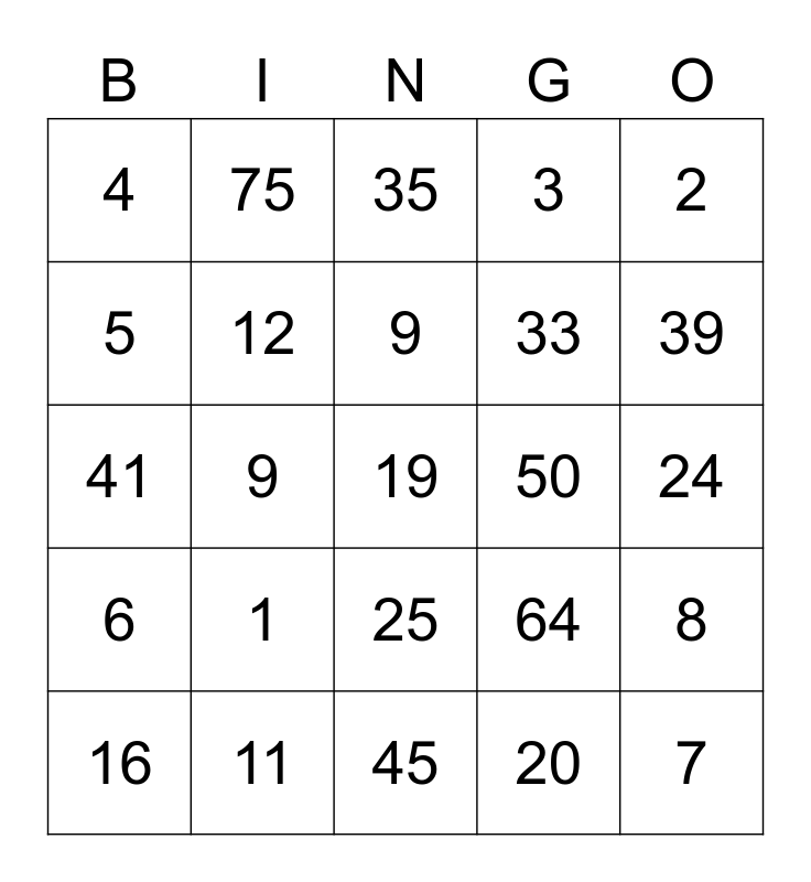 This bingo card has a free space and 24 words: 1, 11, 9, 16, 2, 4, 5, 75, 50, 25, 33, 41, 64, 8, 12, 20, 24, 35, 39, 9, 7, 6, 3 and 45.