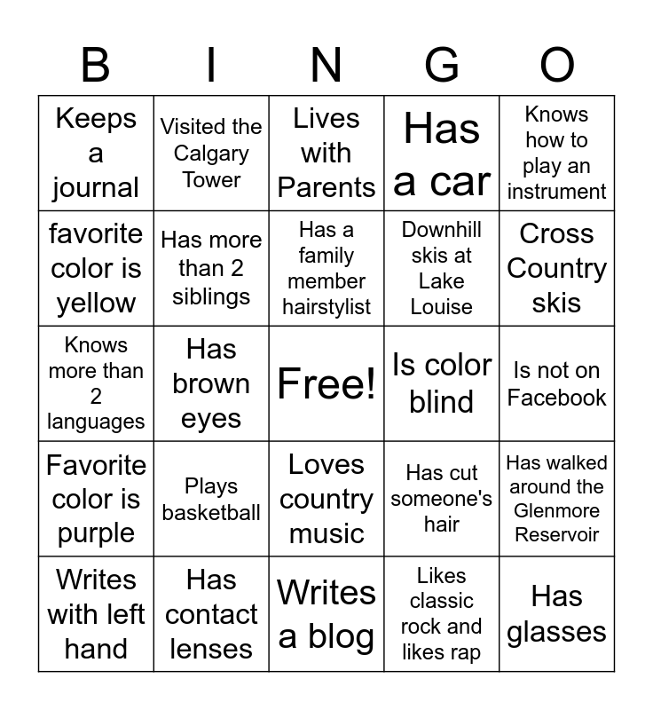 This bingo card has a free space and 39 words: Has a part time job, Lives outside of Calgary, Does not have any pets, Has more than 2 siblings, Writes with left hand, Loves country music, Has a family member hairstylist, Has curly hair, Knows how to play an instrument, Favorite color is purple, Has brown eyes, Has a car, Has glasses, Is not on Facebook, Is color blind, Plays basketball, favorite color is blue, Keeps a journal, Hiked in the Mountains, Has cut someone's hair, favorite color is yellow, Writes a blog, Downhill skis at Lake Louise, Cross Country skis, Snowshoes in the winter, Doesn’t like winter sports, Likes to read books, Has a land line phone, Floated down the Bow River, Visited the Calgary Tower, Never attended Calgary Stampede, Has livestock, Lives with Parents, Has contact lenses, Likes classic rock and likes rap, Likes rap and doesn’t like classic Rock, Has walked around the Glenmore Reservoir, Knows more than 2 languages and Attends SAIT from outside of Calgary.