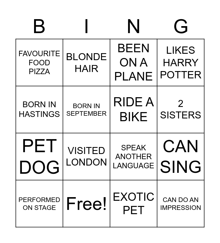 This bingo card has 24 words: BROWN HAIR, SWUM IN SEA, 2 SISTERS, LIVES IN A FLAT, BORN IN HASTINGS, FAVOURITE FOOD PIZZA, BORN IN SEPTEMBER, BLONDE HAIR, Free!, PLAY FOOTBALL, PET DOG, SPEAK ANOTHER LANGUAGE, HAVE A YOUNGER SIBLING, PET CAT, RIDE A BIKE, IS LEFT HANDED, EXOTIC PET, BEEN ON A PLANE, VISITED LONDON, CAN SING, PERFORMED ON STAGE, CAN DO AN IMPRESSION, LIKES HARRY POTTER and BORN IN AUGUST.