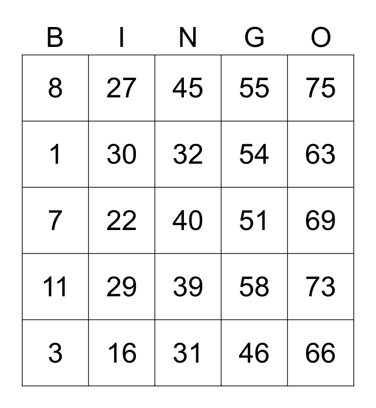 This bingo card has 25 words: 11, 16, 40, 46, 75, 8, 27, 45, 51, 73, 1, 30, 31, 58, 63, 3, 22, 32, 54, 69, 7, 29, 39, 55 and 66.