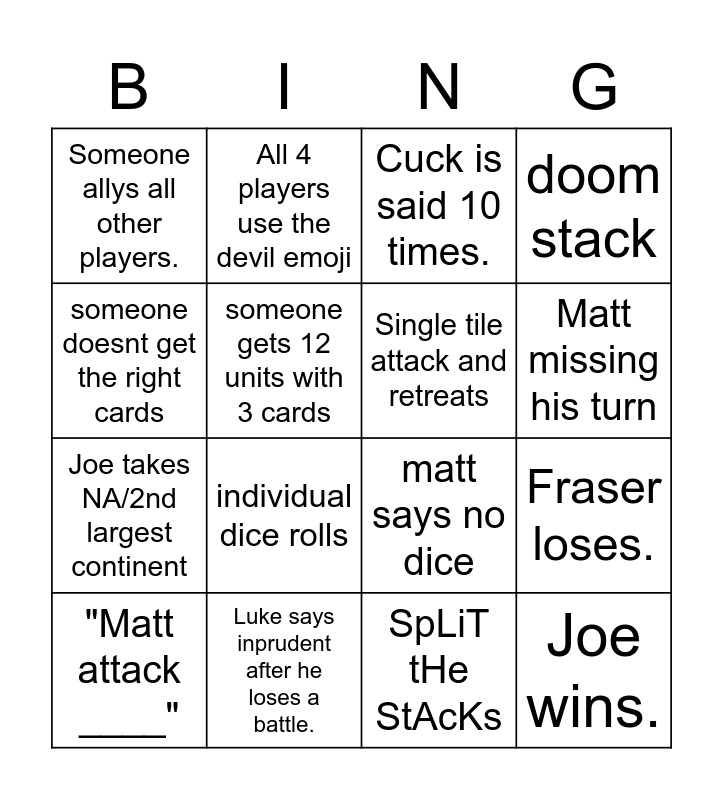 This bingo card has 16 words: Luke says inprudent after he loses a battle., Fraser loses., Cuck is said 10 times., Someone allys all other players., Joe takes NA/2nd largest continent, All 4 players use the devil emoji, matt says no dice, SpLiT tHe StAcKs, someone doesnt get the right cards, someone gets 12 units with 3 cards, "Matt attack ____", doom stack, individual dice rolls, Matt missing his turn, Single tile attack and retreats and Joe wins..