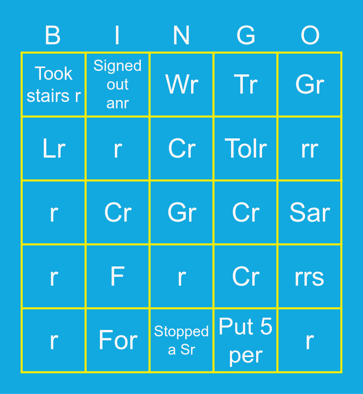 This bingo card has a free space and 24 words: F, For, Cr, r, Gr, Took stairs r, Lr, Signed out anr, Cr, r, Tolr, r, Cr, rrs, r, Put 5 per, Sar, Wr, rr, Cr, r, r, Tr and Stopped a Sr.