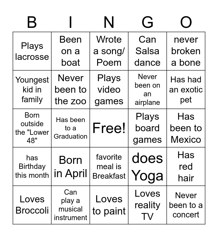This bingo card has a free space and 78 words: Does not have any pets, Loves Country Music, Wrote a song/ Poem, is vege- tarian, Is left-handed, wearing a headband now, Never been out of USA, Is an only child, Ran a marathon, Has a Job, Had/has Braces, has Driver License, Can Salsa dance, Plays lacrosse, Loves to Read, Youngest kid in family, Born during a Leap Year, Born in April, lived on a farm, Has been to Mexico, Has curly hair, never broken a bone, Born outside the "Lower 48", Plays video games, Never been to the zoo, Was born & raised in Dallas, has been in hot air balloon, Has been on a motorcycle, Failed their first driving test, met a celebrity, Has had an exotic pet, Has a tattoo, Loves to paint, Wears glasses, Loves Broccoli, Plays board games, is the oldest child, Favorite food is pizza, Never been to a carnival, Never been to a concert, Enjoys the theater, Plays Basketball, Rides horses, Swam in the ocean, Swam in a natural lake, Been on a boat, Still has a childhood friend, Has owned a horse, Enjoy working out, Never had a cavity, Has red hair, Has been to a Graduation, does Yoga, Does not drink milk, Has more than four siblings, Dislikes mushrooms, Enjoys Math, Love to swim, Prefer to be indoors, favorite meal is Breakfast, Never been on an airplane, Prefer to be outdoors, Has been to 10+ states, Own a fish, is afraid of spiders, Had a haircut in the last 2 Weeks, has NO social media, Loves Karaoke, has Birthday this month, Can play a musical instrument, Speaks MORE than one language, Flosses teeth DAILY, Played on school sports team, Has broken a bone, Loves reality TV, is allergic to nuts, never saw Star Wars and has done UIL.