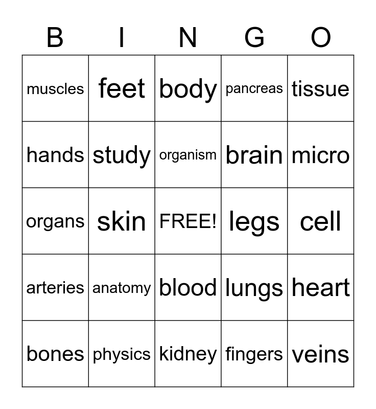 This bingo card has a free space and 24 words: anatomy, physics, organism, bones, tissue, muscles, hands, feet, legs, blood, brain, organs, lungs, heart, study, fingers, cell, body, micro, skin, veins, arteries, pancreas and kidney.