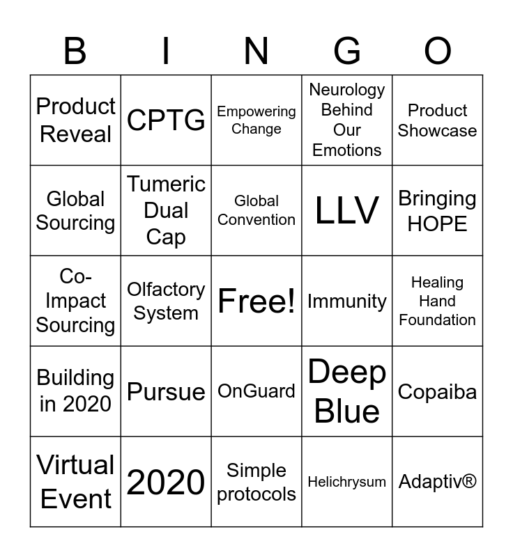 This bingo card has a free space and 24 words: Pursue, 2020, Global Convention, Virtual Event, Product Showcase, Product Reveal, Global Sourcing, CPTG, Immunity, OnGuard, LLV, Co-Impact Sourcing, Deep Blue, Copaiba, Tumeric Dual Cap, Helichrysum, Healing Hand Foundation, Empowering Change, Bringing HOPE, Olfactory System, Adaptiv®, Building in 2020, Neurology Behind Our Emotions and Simple protocols.