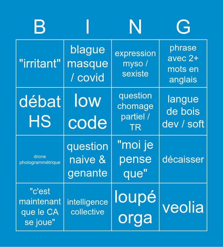 This bingo card has 16 words: intelligence collective, décaisser, expression myso / sexiste, "irritant", drone photogrammétrique, blague masque / covid, "moi je pense que", loupé orga, débat HS, low code, "c'est maintenant que le CA se joue", phrase avec 2+ mots en anglais, question naive & genante, langue de bois dev / soft, question chomage partiel / TR and veolia.