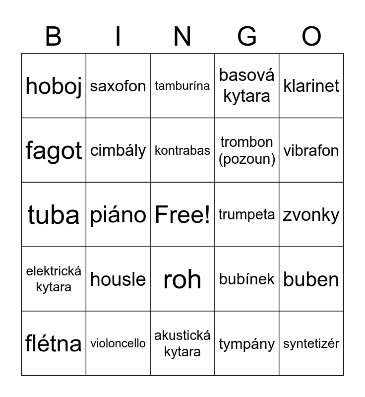 This bingo card has a free space and 24 words: housle, violoncello, kontrabas, flétna, klarinet, hoboj, fagot, saxofon, trumpeta, roh, trombon (pozoun), tuba, bubínek, buben, cimbály, tympány, zvonky, tamburína, vibrafon, piáno, syntetizér, elektrická kytara, basová kytara and akustická kytara.