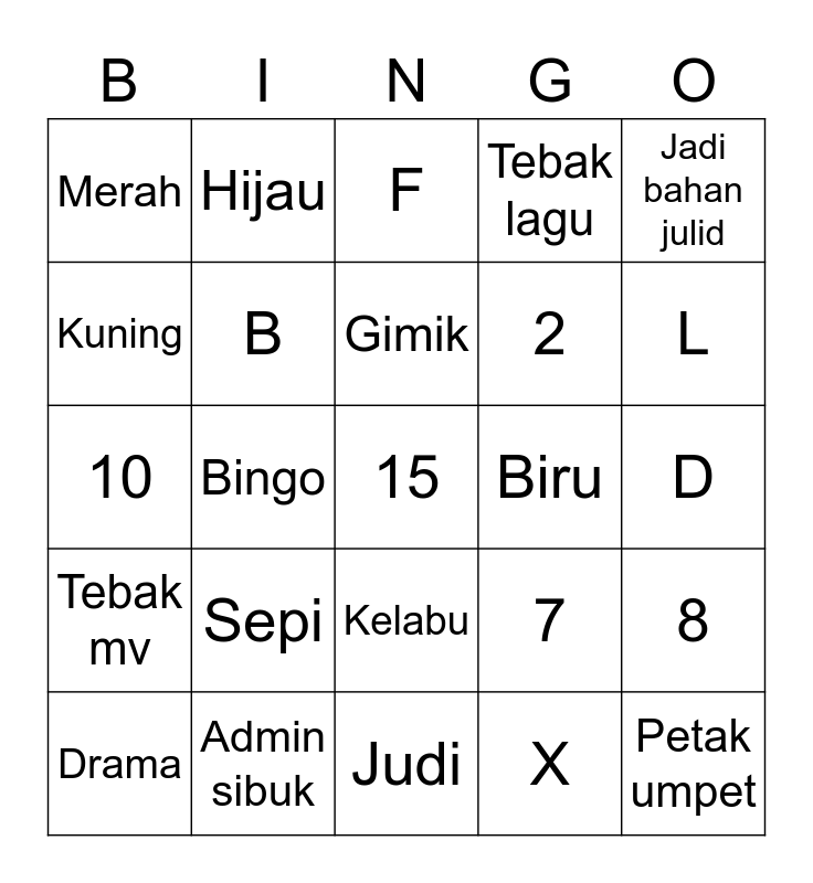 This bingo card has a free space and 24 words: Sepi, Admin sibuk, Gimik, Drama, Jadi bahan julid, Merah, Kuning, Hijau, Biru, Kelabu, 2, 10, 7, 8, B, X, D, F, L, Bingo, Petak umpet, Tebak mv, Tebak lagu and Judi.