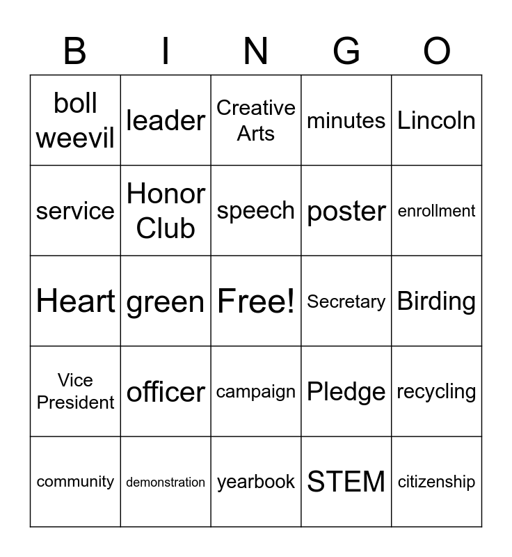 This bingo card has a free space and 24 words: officer, demonstration, speech, community, Lincoln, boll weevil, service, leader, Secretary, campaign, poster, Heart, Pledge, recycling, Honor Club, STEM, Birding, Creative Arts, enrollment, green, citizenship, Vice President, minutes and yearbook.