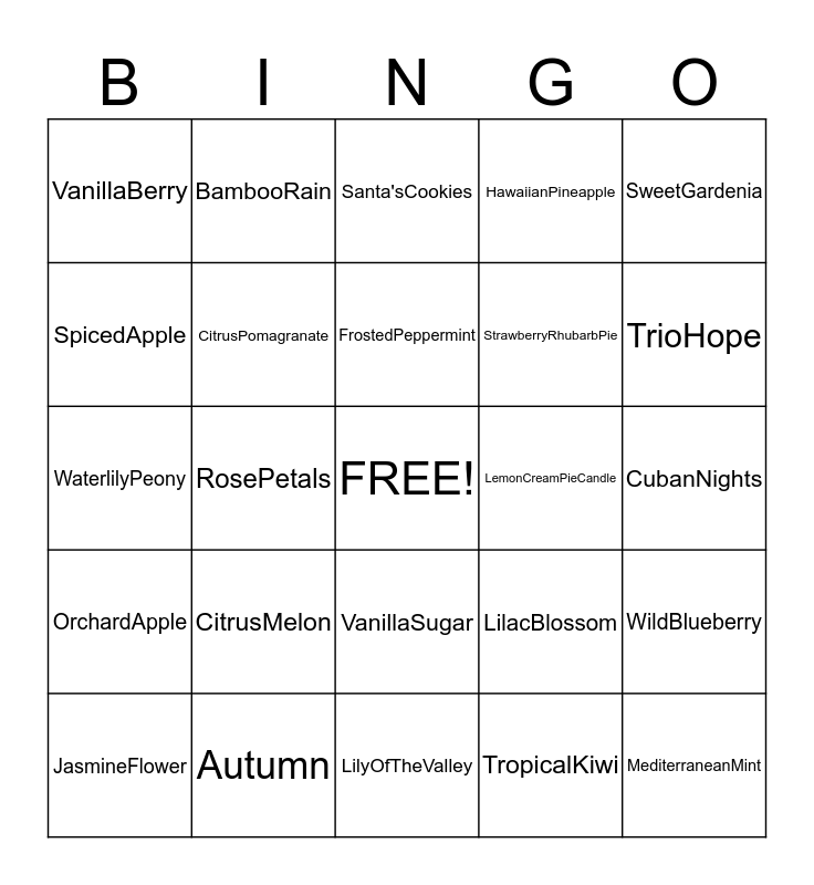 This bingo card has a free space and 34 words: BirthdayCake, TropicalKiwi, PumpkinCaramel, CalmLavender, OrchardApple, CitrusPomagranate, SweetGardenia, JasmineFlower, BambooRain, CypressMistletoe, FrostedPeppermint, Santa'sCookies, ConcordGrape, GrapefruitPomegranate, LemonCreamPieCandle, TrioHope, Autumn, WaterlilyPeony, CitrusMelon, LilacBlossom, VanillaSugar, LemonLimeGinger, VanillaBerry, CubanNights, LilyOfTheValley, MediterraneanMint, HawaiianPineapple, CoconutParadise, StrawberryRhubarbPie, SpicedApple, CinnamonBuns, RosePetals, WildBlueberry and VanillaBean.