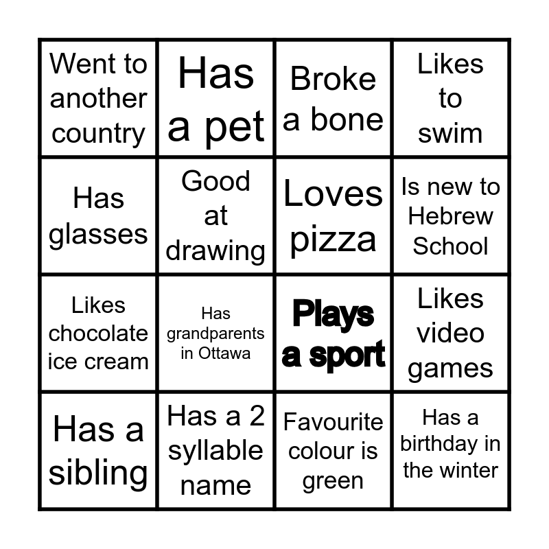 This bingo card has 16 words: Has a 2 syllable name, Likes video games, Broke a bone, Went to another country, Likes chocolate ice cream, Has a pet, Plays a sport, Favourite colour is green, Has glasses, Good at drawing, Has a sibling, Likes to swim, Has grandparents in Ottawa, Is new to Hebrew School, Loves pizza and Has a birthday in the winter.
