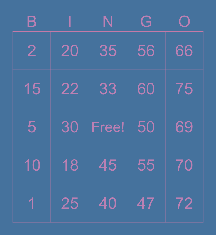 This bingo card has a free space and 24 words: 1, 18, 33, 47, 66, 2, 20, 35, 50, 69, 5, 22, 55, 70, 15, 25, 40, 56, 75, 10, 30, 45, 60 and 72.